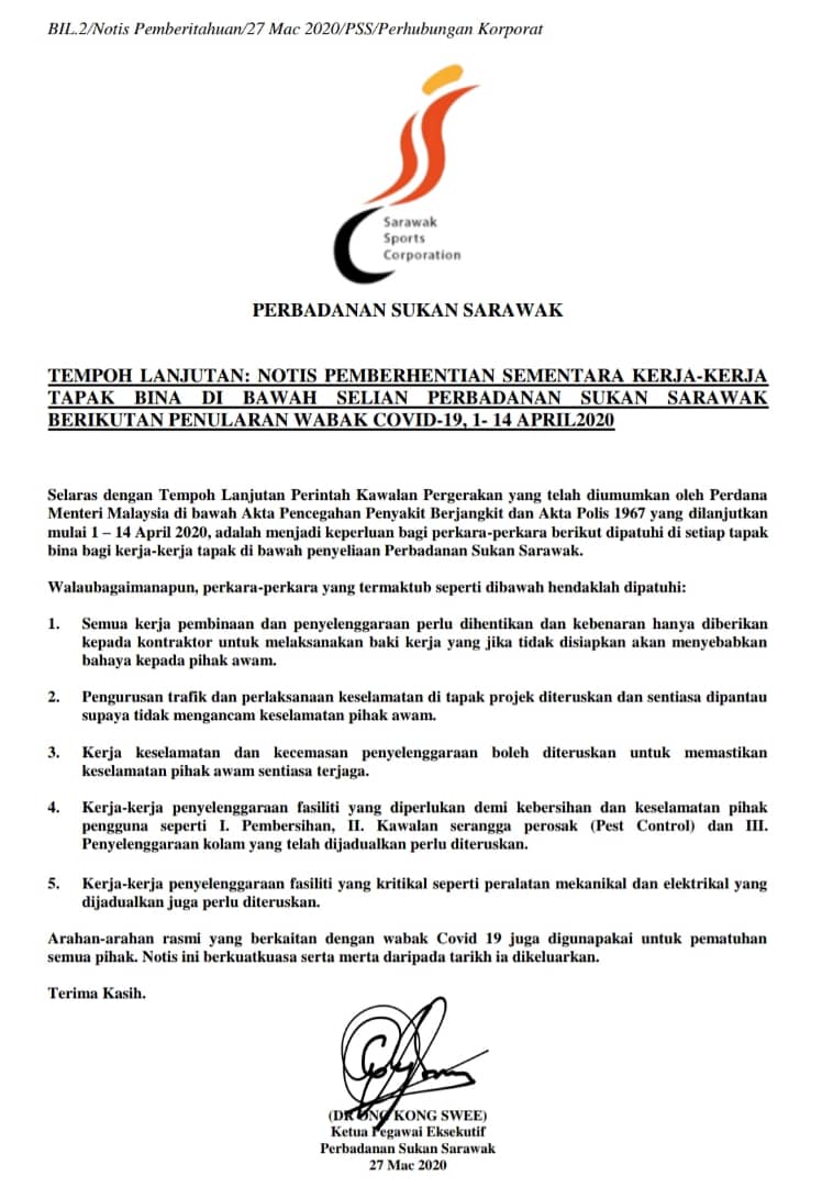 砂拉越体育机构将暂时终止任何有关建筑工作的活动从18号开始至31号