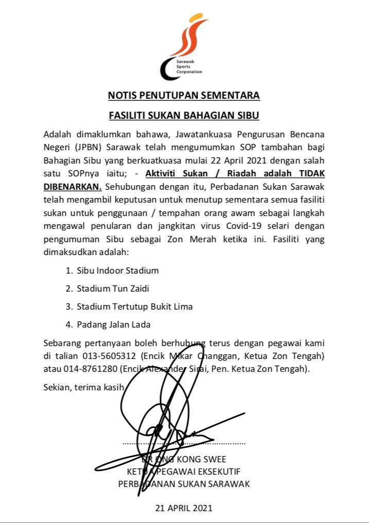 Adalah dimaklumkan bahawa Jatankuasa Pengurusan Bencana Negeri (JPBN) Sarawak telah mengumumkan SOP tambahan bagi Bahagian Sibu yang berkuatkuasa mulai 22 April 2021 dengan salah satu SOP iaitu; – Aktiviti Sukan / Riadah adalah TIDAK DIBENARKAN. Sehubungan dengan itu, Perbadanan Sukan Sarawak telah mengambil keputusan untuk menutup sementara semua fasiliti sukan untuk penggunaa/tempahan orang awam sebagai langkah mengawal penularan dan jangkitan virus Covid-19 selari dengan pengumuman Sibu sebagai Zon Merah ketika ini. Fasiliti dimaksudkan adalah: