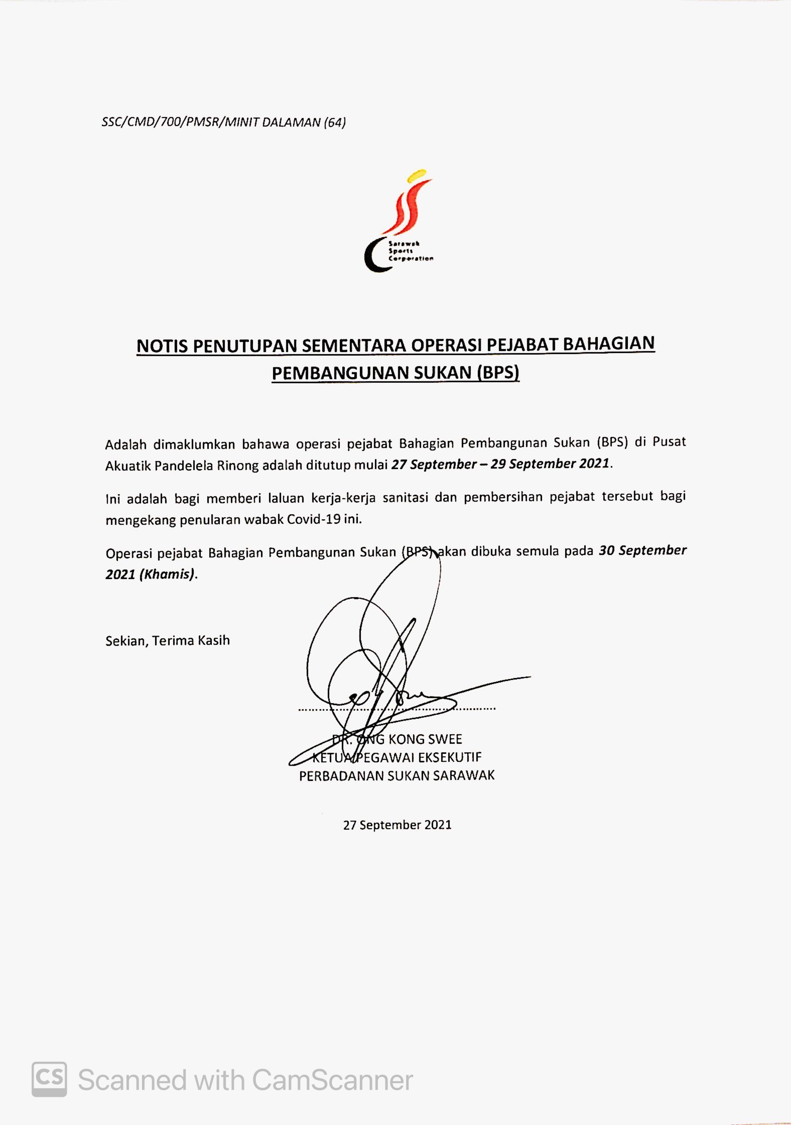 Adalah dimaklumkan bahawa operasi pejabat Bahagian Pembangunan Sukan (BPS) di Pusat Akuatik Pandelela Rinong adalah ditutup mulai 27 September – 29 September 2021.