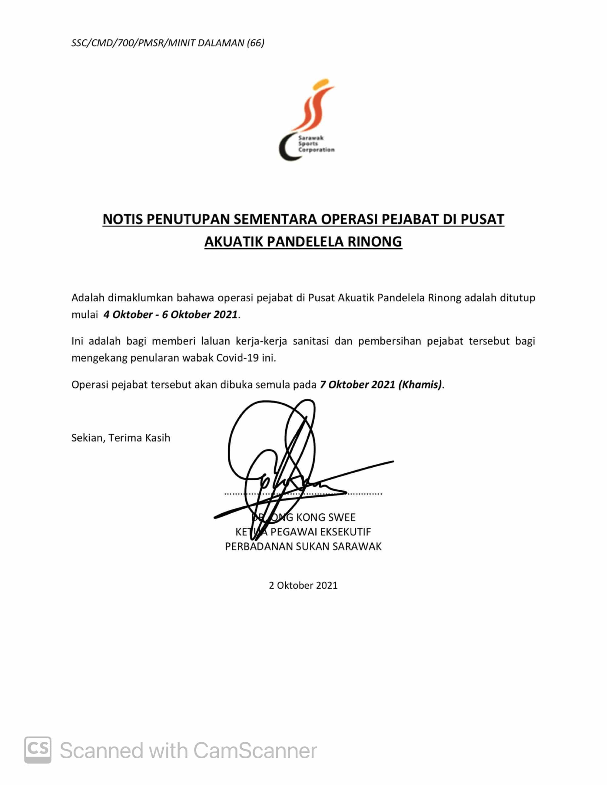Adalah dimaklumkan bahawa operasi pejabat di Pusat Akuatik Pandelela Rinong adalah ditutup mulai 4 Oktober – 6 Oktober 2021.