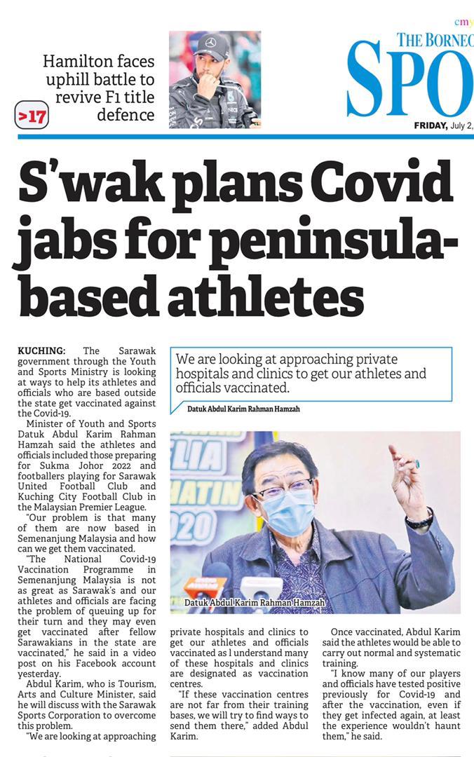 Kuching (2 July): The Sarawak government through the Youth and Sports Ministry is looking at ways to help its athletes and officials who are based outside the state get vaccinated against the Covid-19.